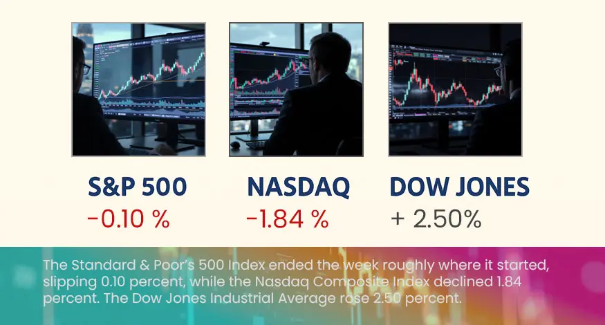 The Standard & Poor’s 500 Index ended the week roughly where it started, slipping 0.10 percent, while the Nasdaq Composite Index declined 1.84 percent. The Dow Jones Industrial Average rose 2.50 percent.